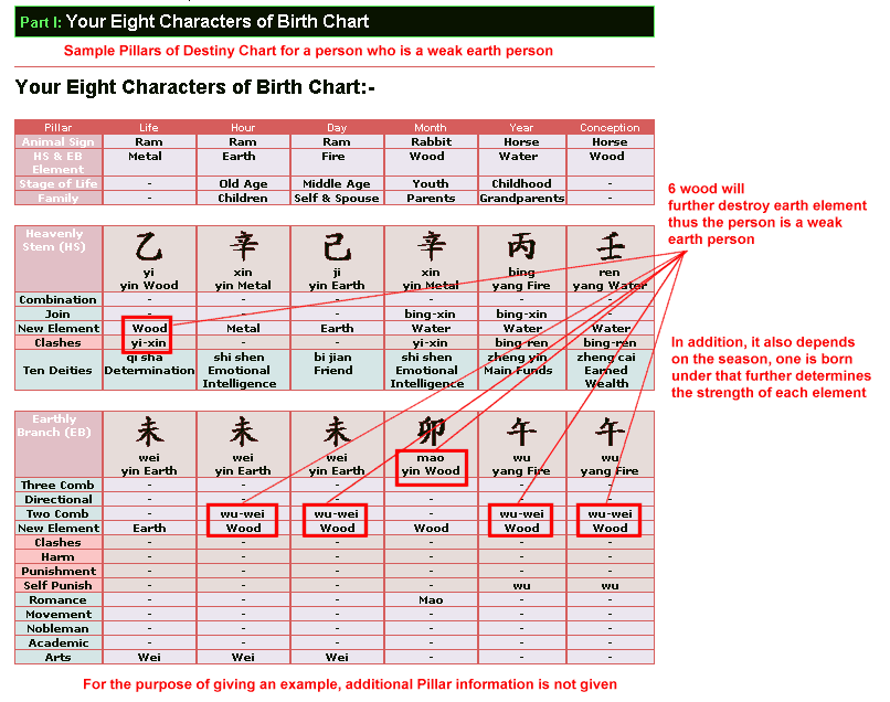 5. These elements are looked at in relation to the day of birth pillar. For example, if the day pillar has earth element. The free report by default only provides the birth element and default the strength to weak.