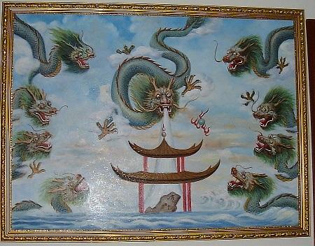 This painting is interesting because it has nine dragons. It was commissioned for me facing a long corridor overlooking a lone lamp post. If one notice carefully, the author dare not sign his name on it for fear of inauspicious sha qi befall onto himself.